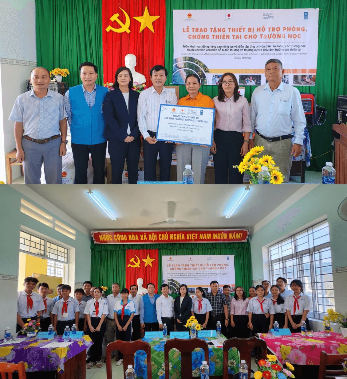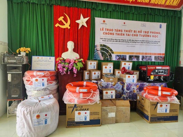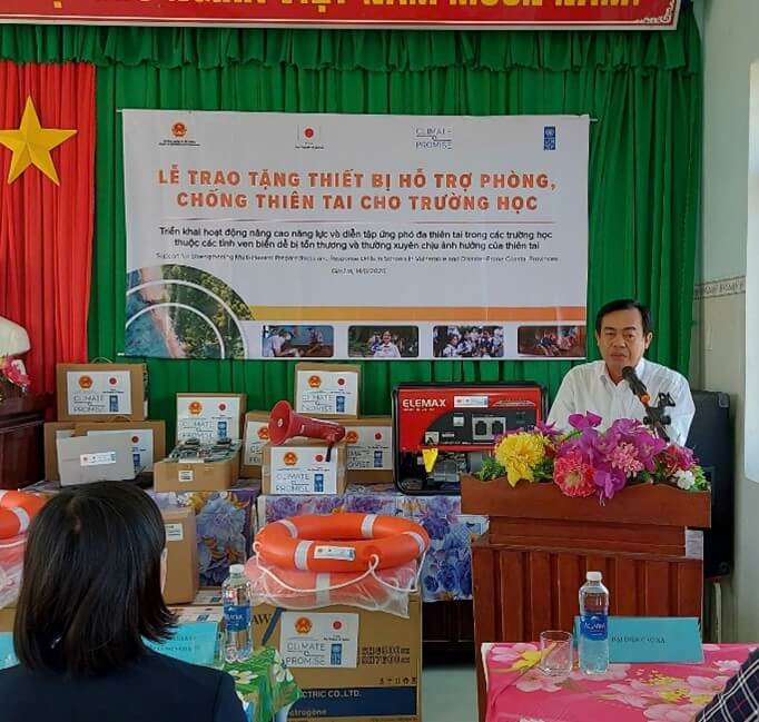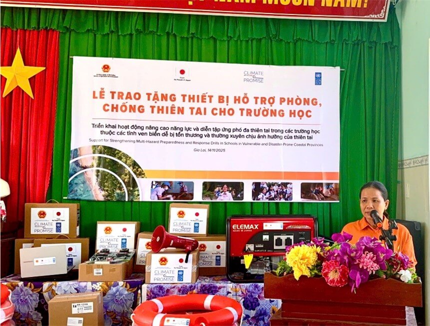 Chiều ngày 14/11/2024, tại Trường THCS Cát Tiến (tỉnh Gia Lai), UNDP, VDDMA, DSQ Nhật Bản, và CEFD đã phối hợp tổ chức Lễ trao tặng thiết bị hỗ trợ nâng cao năng lực ứng phó thiên tai cho 4 trường THCS thuộc tác xã ven biển gồm: THCS Cát Tiến – xã Cát Tiến, THCS Cát Chánh – xã Ngô Mây, THCS Hoài Hải – phương Hoài Nhơn Đông, THCS Tam Quan Bắc – phường Hoài Nhơn Đông. Các thiết bị trao tặng bao gồm máy phát điện, máy tính xách tay, đèn pin, phao cứu sinh, loa cầm tay.
